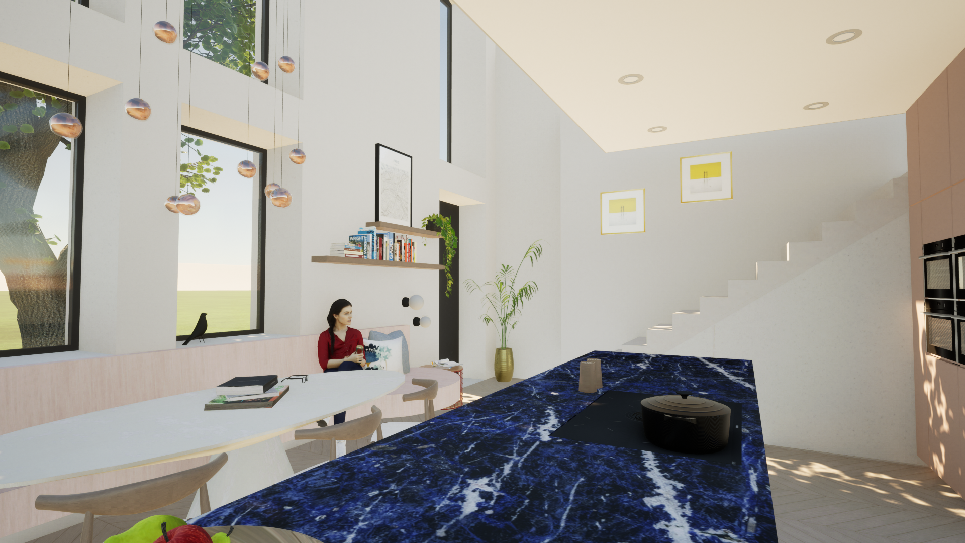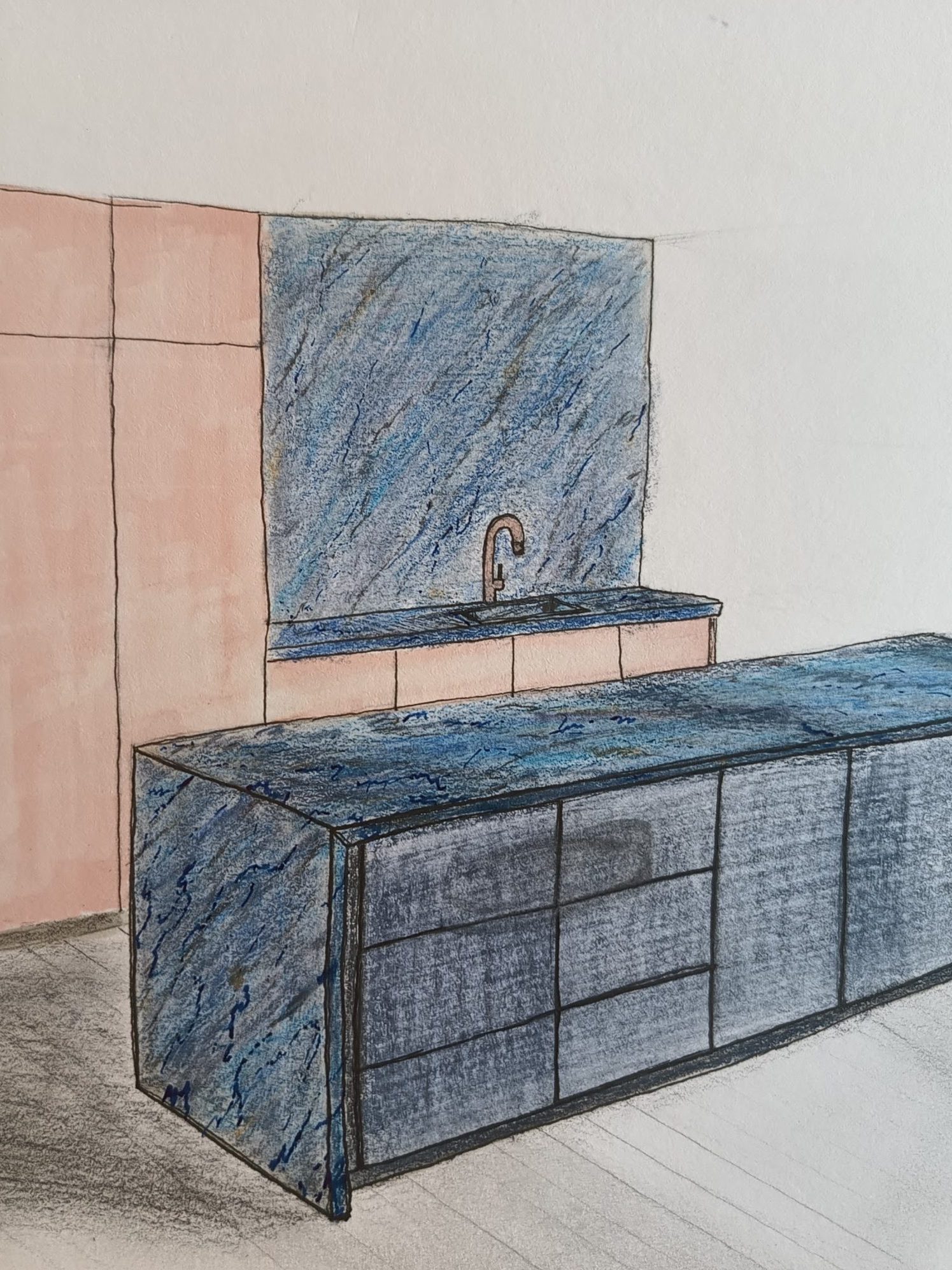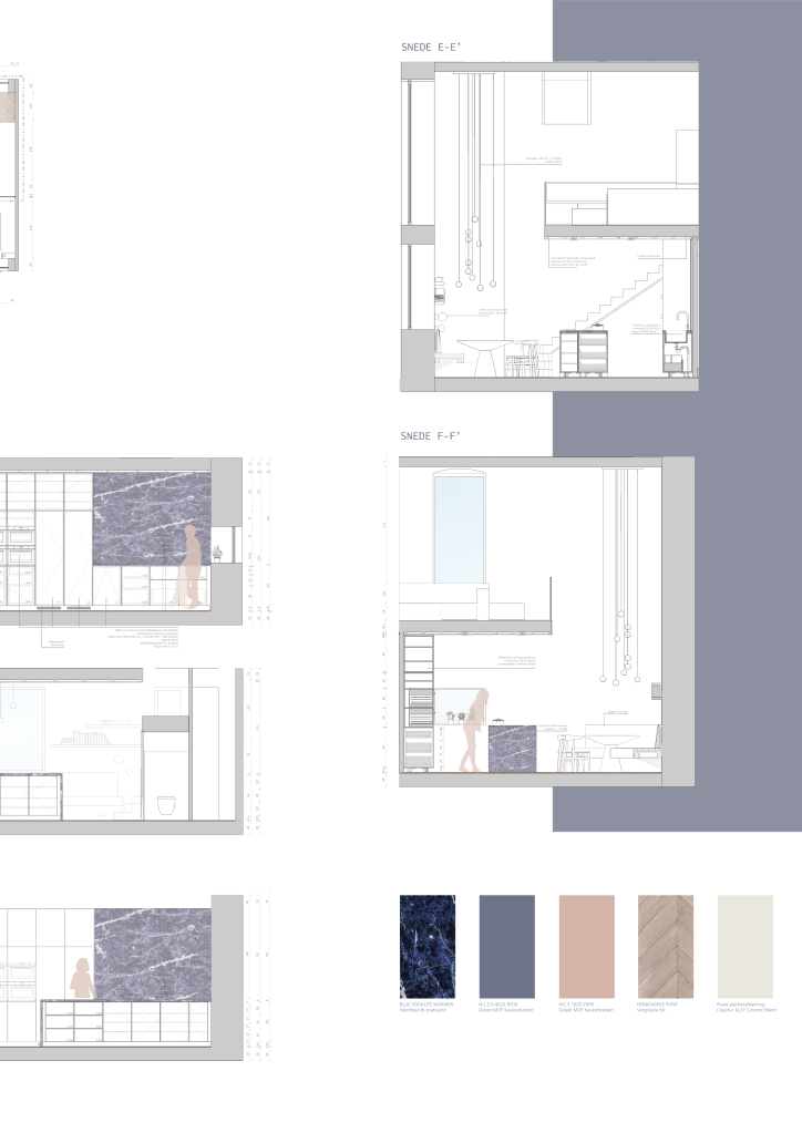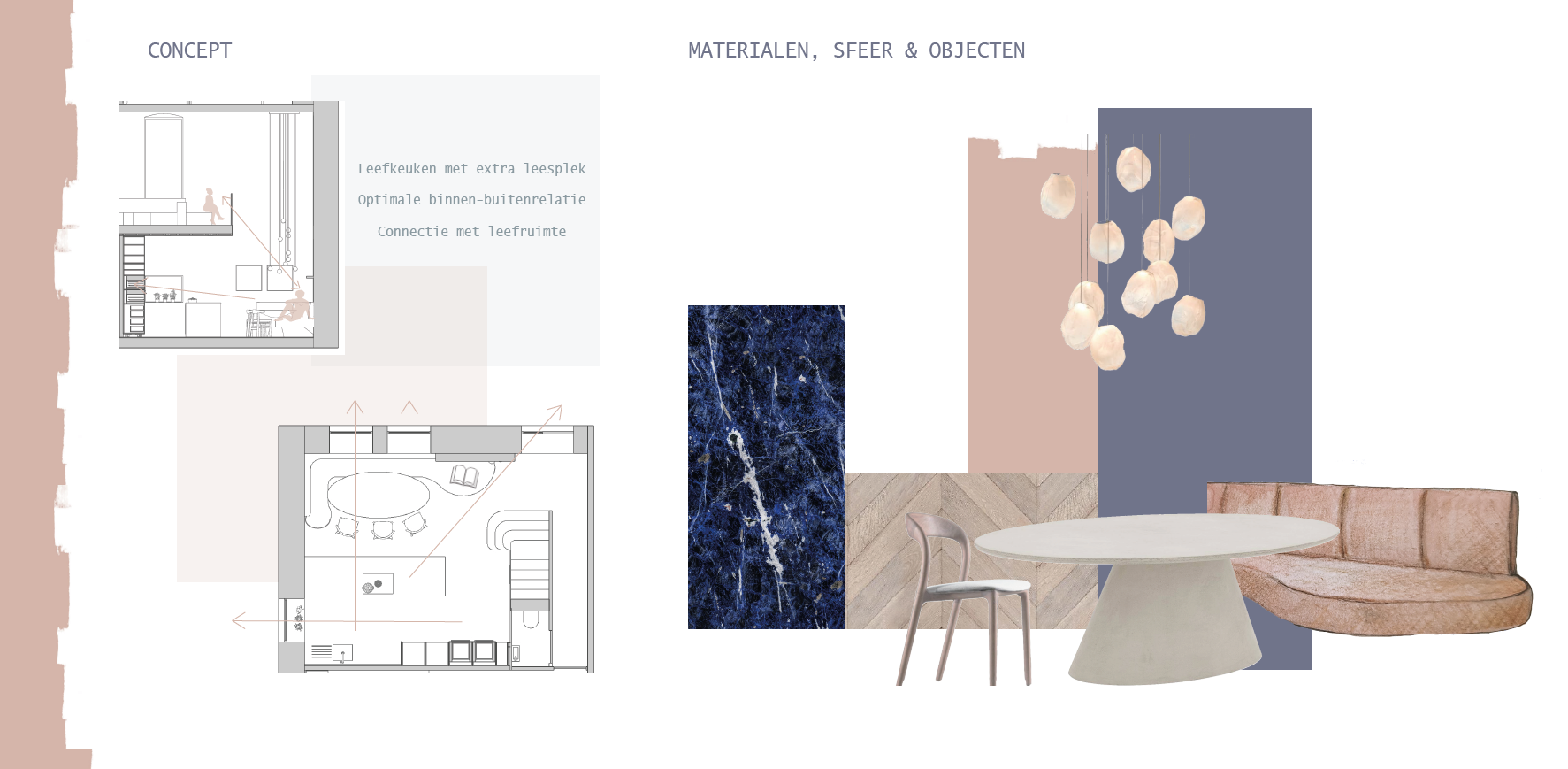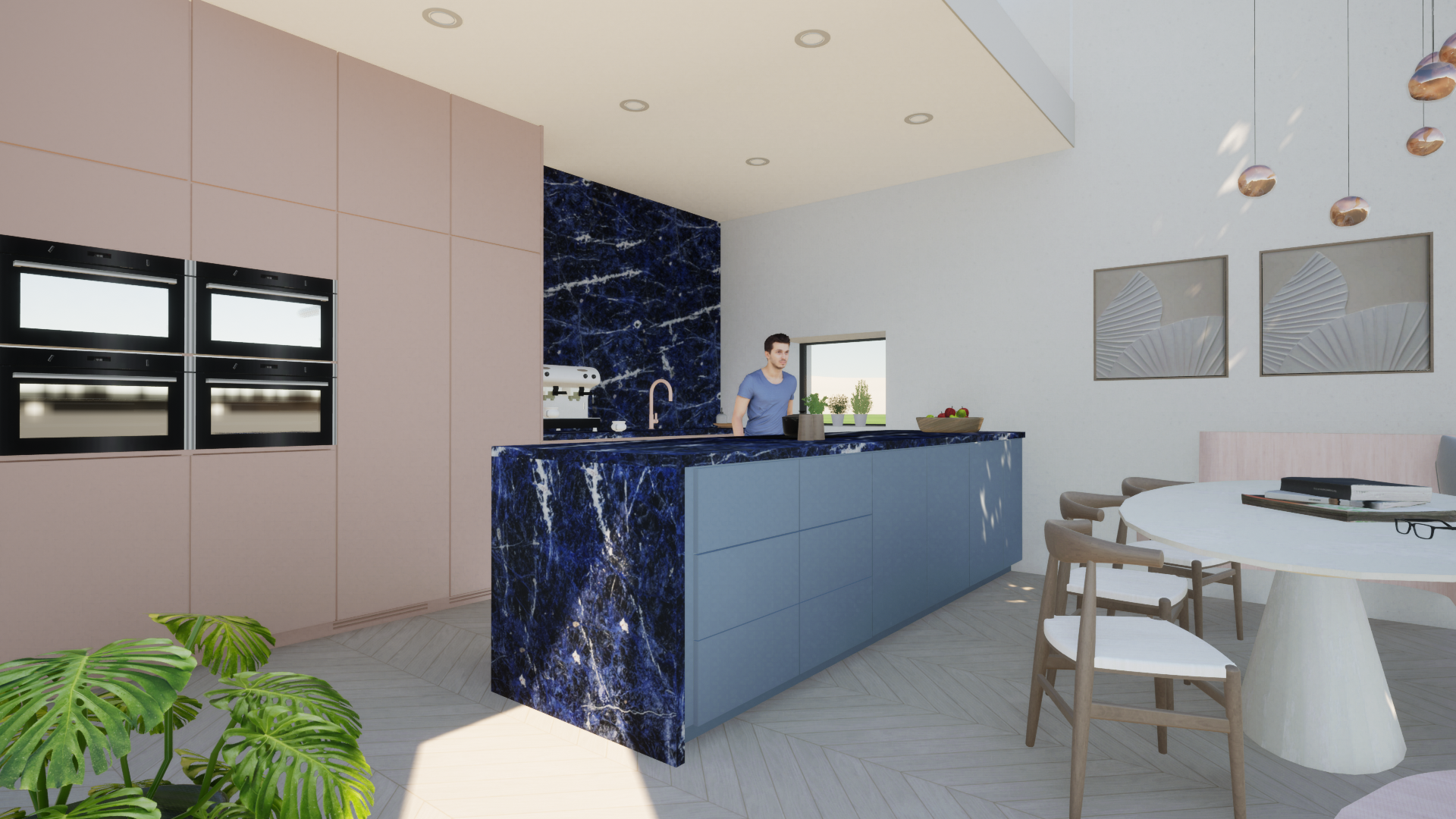Een aangename, lichtrijke keuken waar natuurlijke materialen de hoofdrol spelen en een prachtig blauw marmeren werkblad de eyecatcher is.