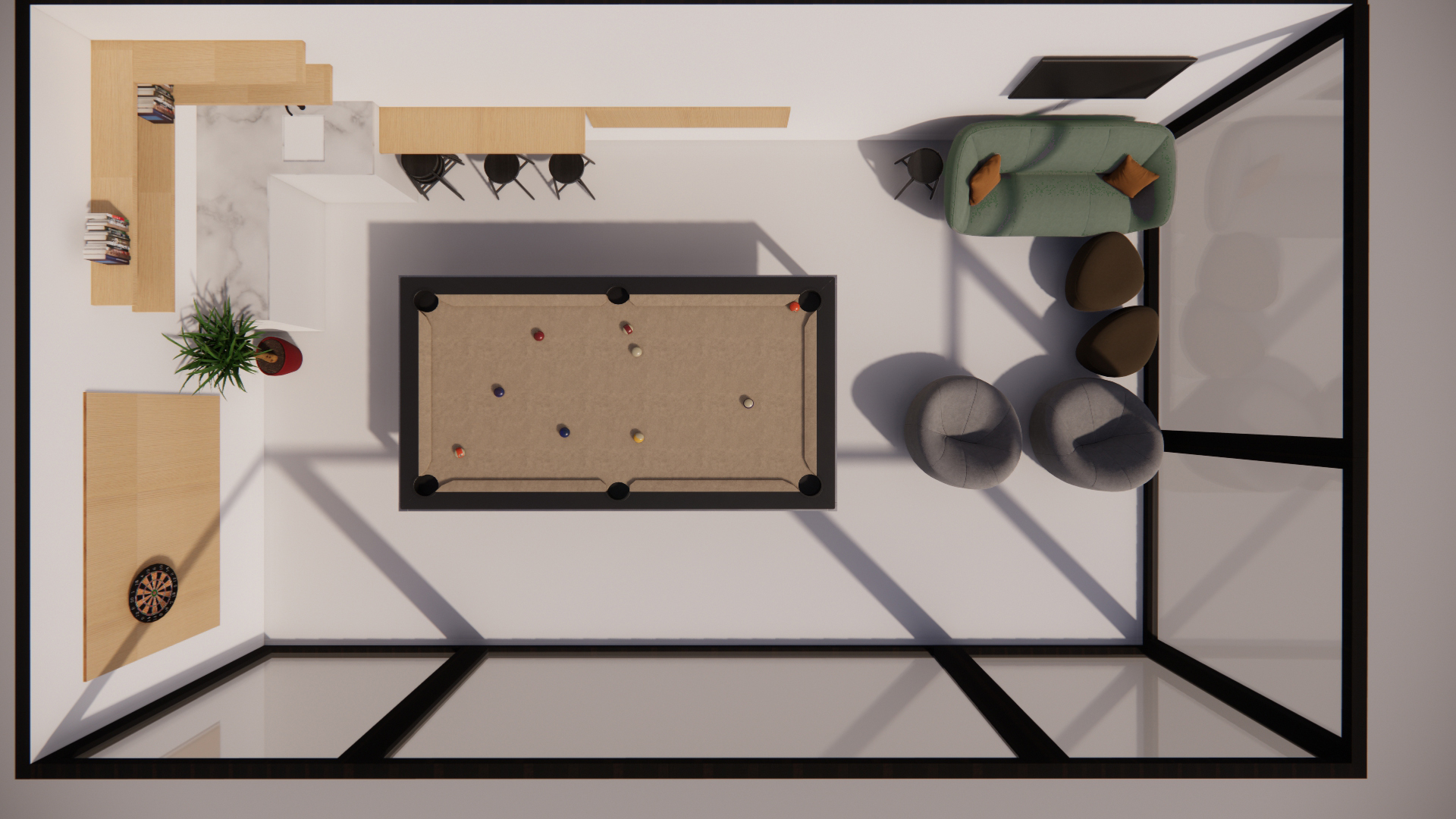 Inrichten Poolhouse met als centraal element een biljarttafel. Integratie van kitchenette en tv-hoek